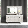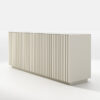 Aparador Conceptos, de diseño singular, acabado chapado o lacado, combinando con su decoración entre puertas y el estante base a juego. Su costado de canto redondeado suaviza y armoniza sus líneas. Los pies cilindricos de metal, le aportan clase y modernidad. Rematando con una elegante sobretapa, de cristal marmolizado o porcelánico.