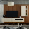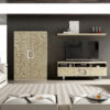 Composición TV Conceptos, de diseño singular, acabado chapado o lacado, combinando con una cenefa entre puertas y el estante bajo a juego. Su costado de canto redondeado suaviza y armoniza sus líneas. Los pies cilíndricos de metal, le aportan clase y modernidad. Rematando con una elegante sobretapa, de cristal marmolizado o porcelánico. Posibilidad de base zócalo.